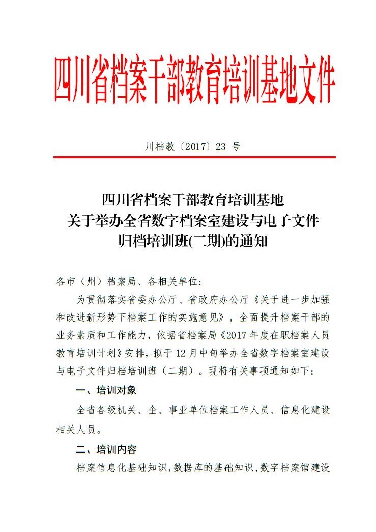 举办全省数字档案室建设与电子文件归档培训班(二期)的通知